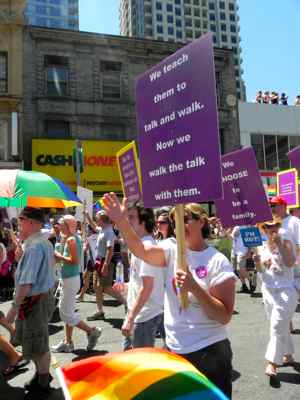 Vários blocos de parentes e amigos de homossexuais desfilando contra o preconceito e a favor da inclusão, famílias com crianças pequenas na plateia, gente que ficou ali, por horas, na fila, só para garantir o melhor lugar durante o desfile.